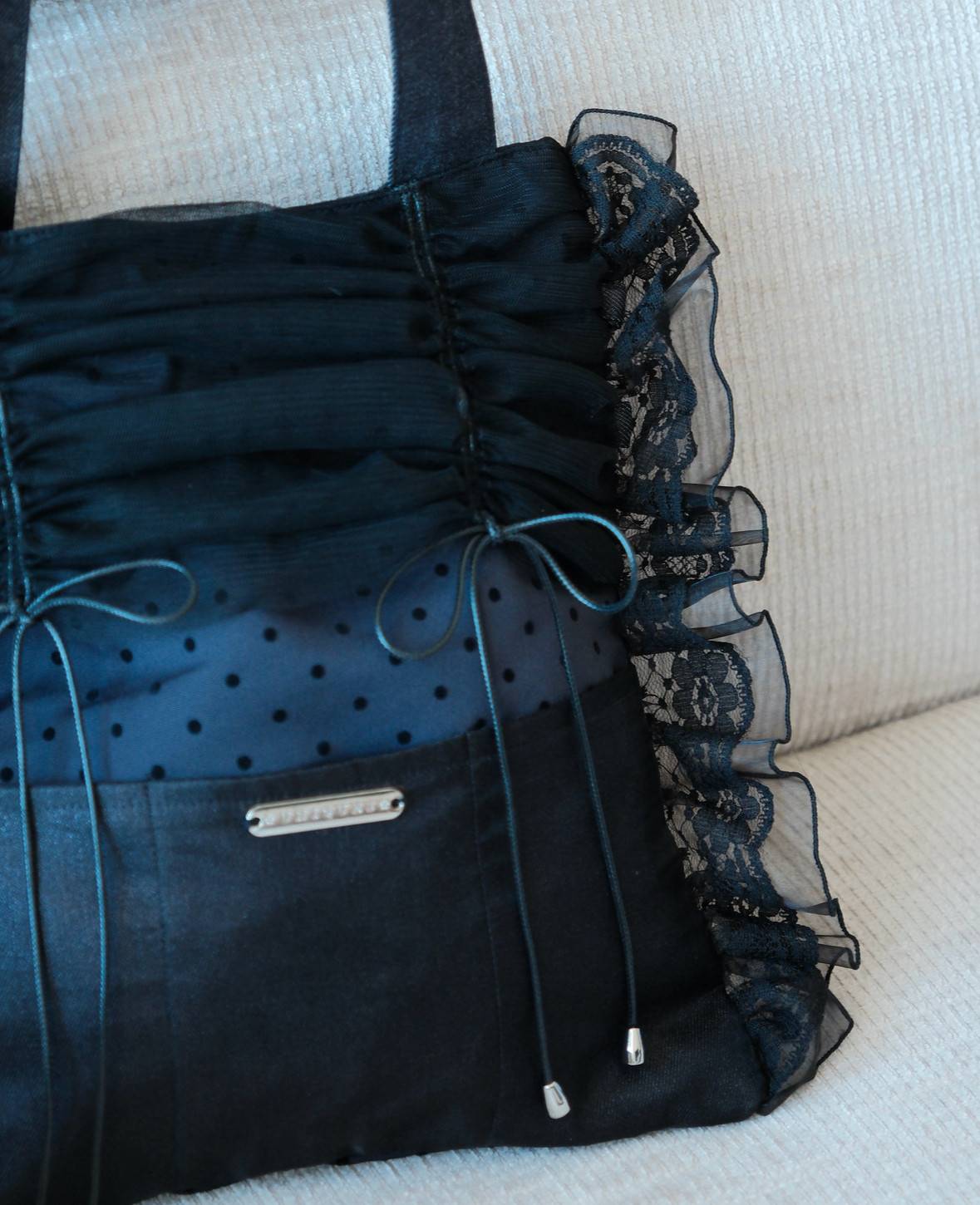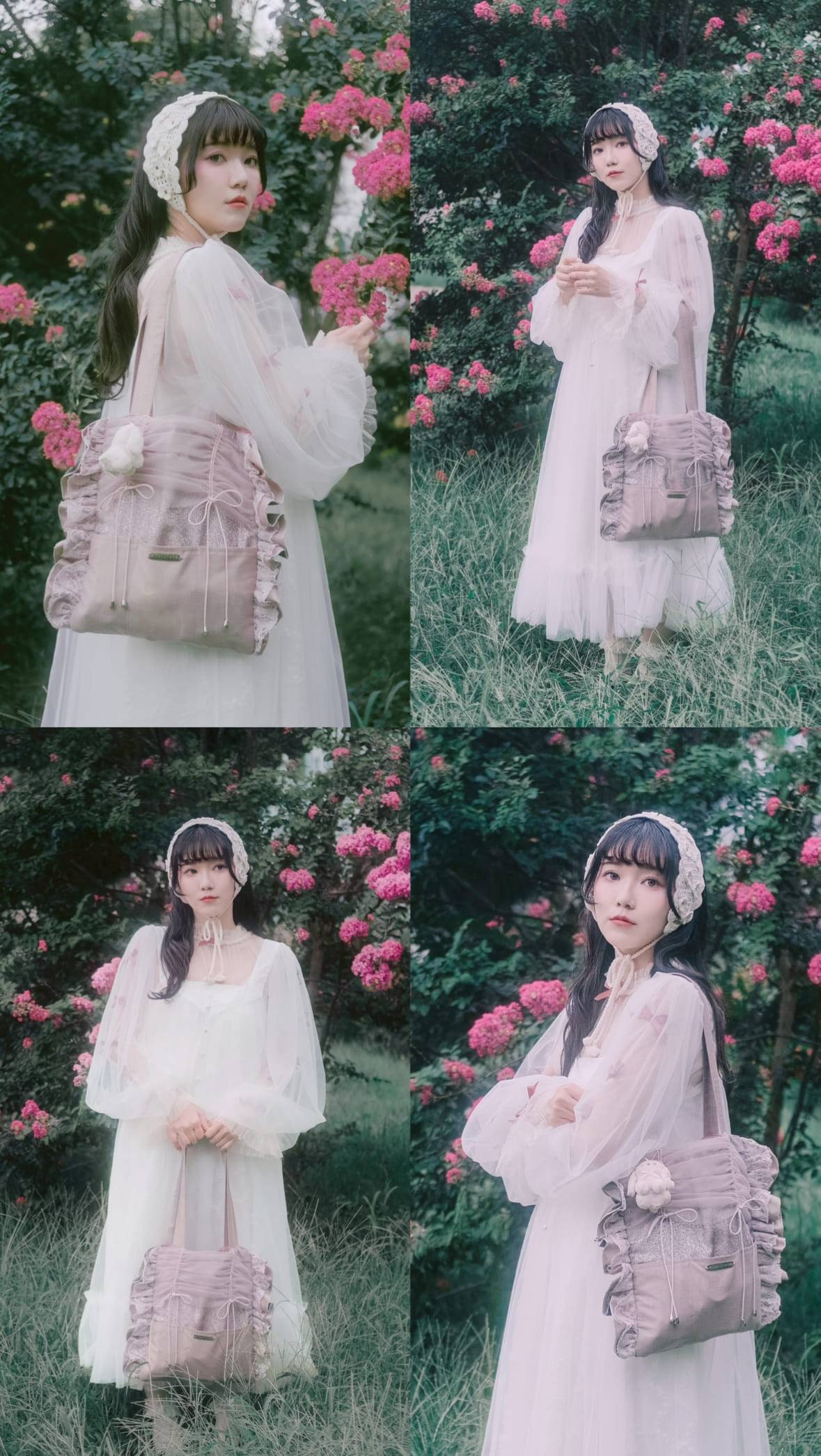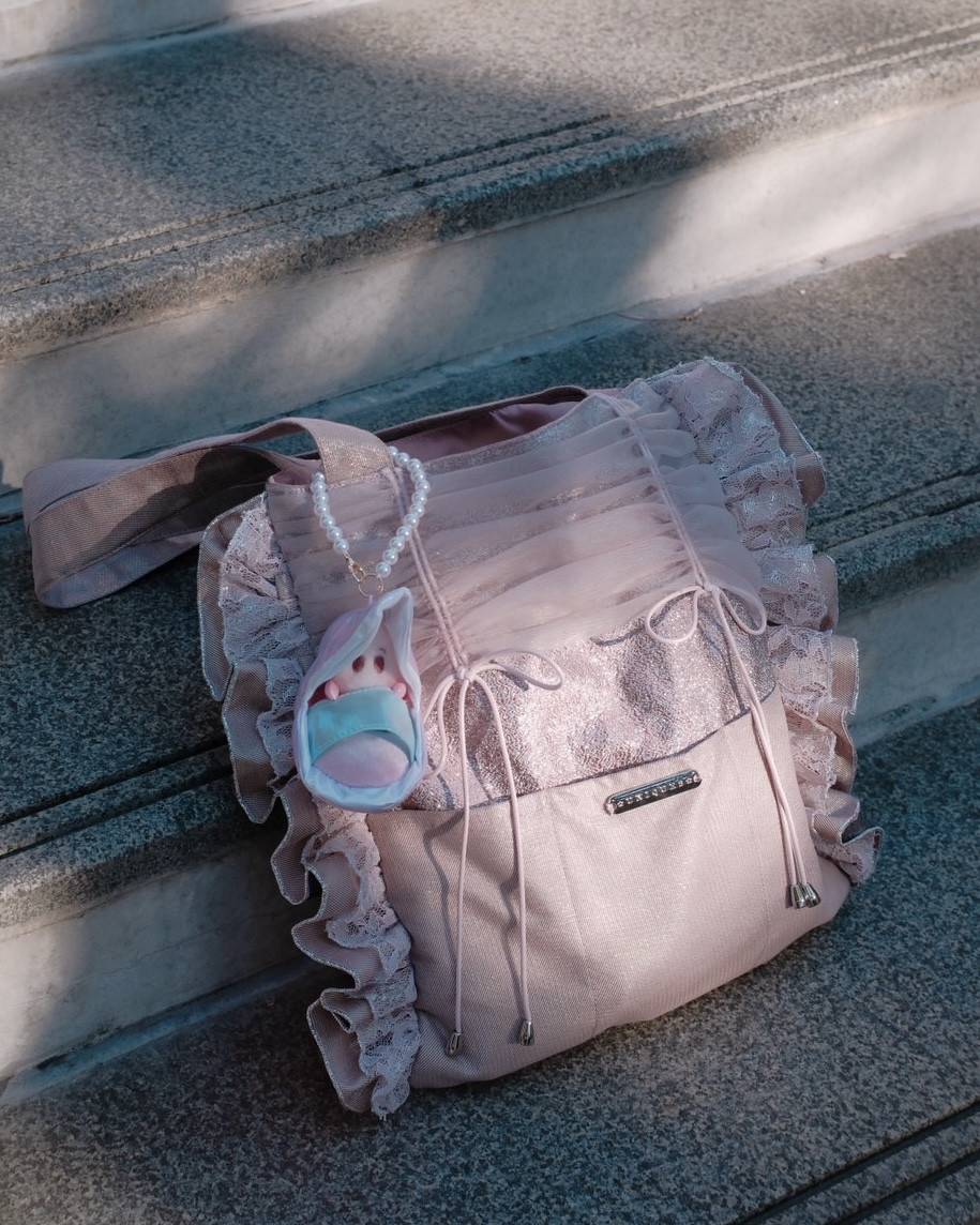 包型配上細細的皺褶薄紗,側邊疊著一層層荷葉邊,像是穿上了輕飄飄的小禮服~正面是透紗設計,佈滿波點或花卉刺繡,低調中藏著小驚喜✨