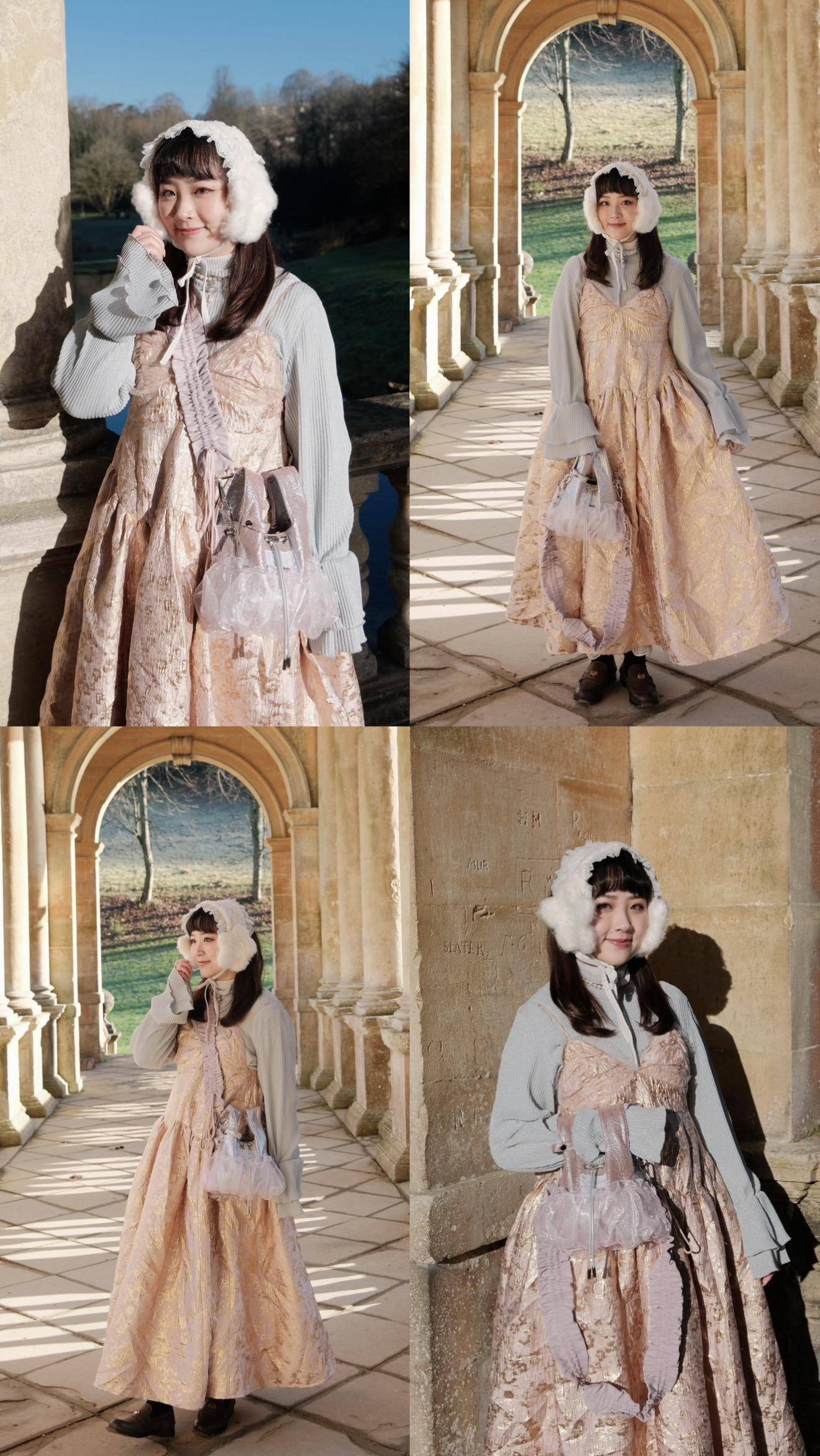 灰藍內搭+金蔥布料超細緻~藕粉水滴包帶一點霧粉色調,在粉色洋裝上不同的粉~整體看起來更有層次!搭起來超級有氣質!!